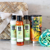 The Gift: The Vintage Passionfruit Deluxe Sarong Basket includes the fan favorite Vintage Passionfruit & Lime Premium Body Wash, Lotion and Oil--all full sized 8.5oz each--a beautiful breadfruit green & black Sarong, and a 20oz Aloha Beverage Tumbler. This is a luxurious gift, sure to please. Share the aloha and we will include a gift card on request (with a hand written note if you leave us a note on checkout).