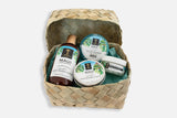 The Naupaka Collection includes: 8.5oz Naupaka Lotion, 2.5oz Naupaka Body Polish, 4oz Naupaka Travel Candle, 4.5oz Naupaka Loofah Soap all handcrafted in Maui and presented in a traditional Hawaiian Lauhala gift basket.