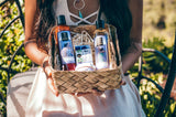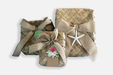 The Pikake Vintage Collection: includes: 8.5oz Pikake Lotion, 8.5oz Pikake Bath & Body Oil, 5oz Pikake Confetti Soap and 2.5oz Pikake Body Polish. All handcrafted botanicals made in Maui and presented in a traditional Hawaiian Lauhala gift basket, tied with a bow (ribbons vary). Pikake celebrates the tiny, white sweet smelling Pikake flower that is Hawaii's favorite lei flower.