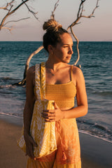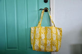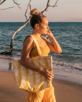 Tote Bag: Upholstery-weight exterior fabric, lined with heavy duty canvas. This golden Maui Pineapple design recalls the sunny, vintage Hawaiian days when the fields were filled with the islands' signature fruit, providing 80% of the world's pineapples. There are two large interior pockets. This durable bag has so many uses - from an overnight bag to a beach bag to a diaper bag. The possibilities are endless! Tote: 15"w x 20"h x 6"d.
